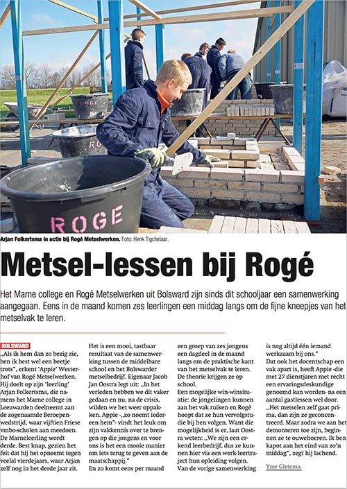 De muren zijn bovendien in wild verband gemetseld met de doorstrijk voeg-techniek. Vervolgens laag om laag afwisselend vlak en 15 mm terug. De 15 mm terug liggende laag moest bovendien vertind worden met witte specie. De letters werden echter een project op zich. Van tevoren tekende de uitvoerder van Rogé, naar voorbeeld van de architect, letter voor letter helemaal uit. Deze tekeningen moesten heel precies gevolgd worden tijdens de bouw, maar het is gelukt. “Het was een hele uitdaging, maar het is echt een mooi stukje werk geworden,” concludeert Jacob Jan Oostra tevreden.